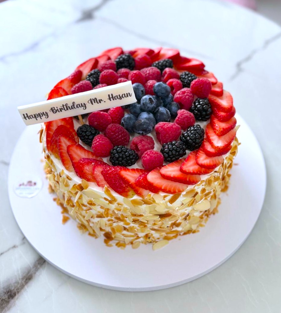 A delightful celebratory cake made with a soft vanilla sponge base, layered to perfection and crowned with a vibrant mix of fresh seasonal berries. Juicy strawberries, blueberries, raspberries, and blackberries come together in a colorful, refreshing topping that bursts with natural sweetness. The sides are beautifully coated with toasted almond flakes, adding a delicate crunch and rich nutty flavor to every bite. A perfect centerpiece for any special occasion.